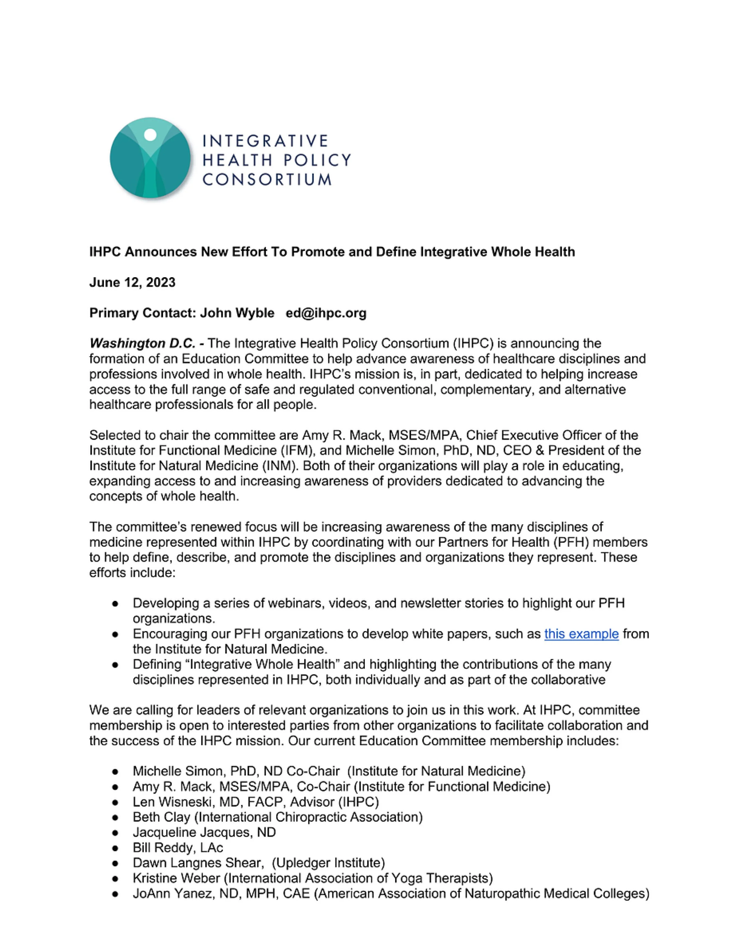 Here’s a link to the Integrative Health Policy Consortium’s June 12, 2023 Press Release that is shown to the right…